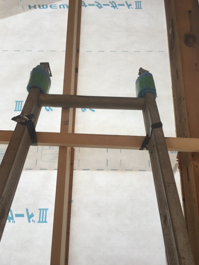 梯子の上と足元をずれない様にしっかりと固定。