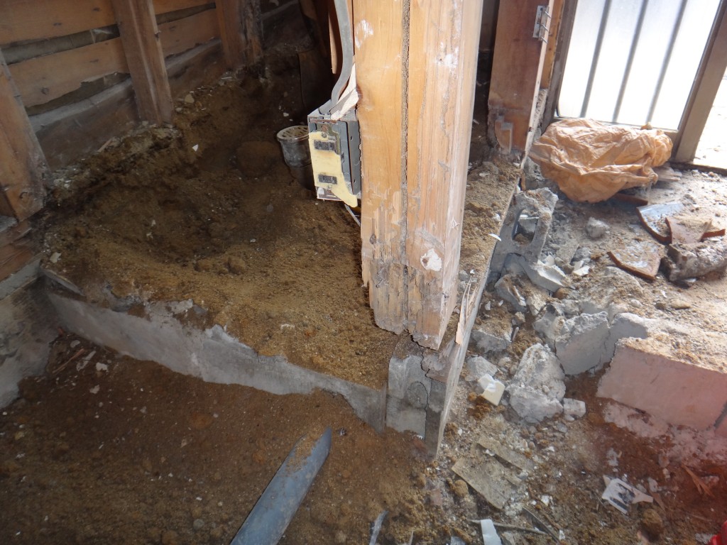 ↑腐食が進んで土台が大地に還ってしまったパターンです。柱は宙に浮いています。