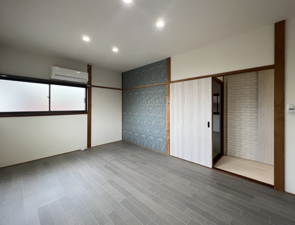 お施主様の希望で壁はグレー、襖はクロス貼りとし、アクセントで柄の入ったものに。