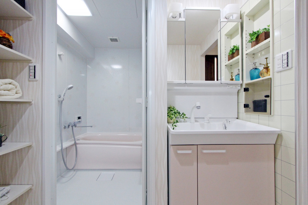 新しくした洗面台・お風呂はピンク色であたたかな雰囲気になりました☆
