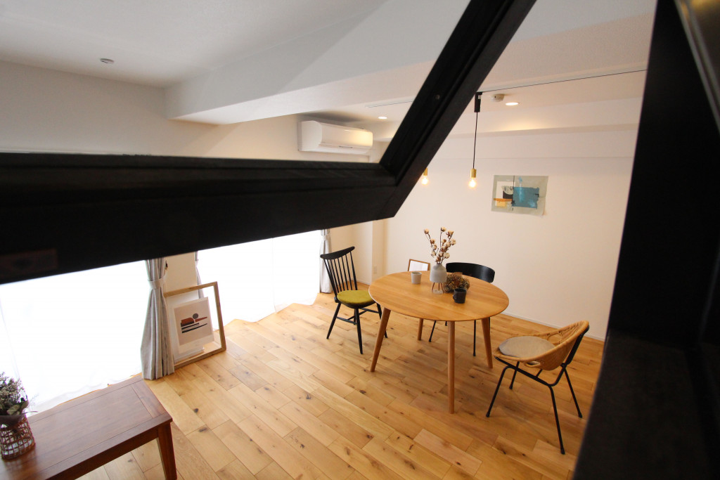 LDKの一画にご主人様の書斎スペースを計画。窓を設けることでプライベート感も確保した上で、お部屋の孤立感を和らげる効果も。開閉式にすることで夫婦間のコミュニケーションも取りやすくなります。