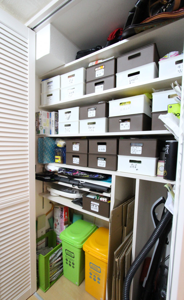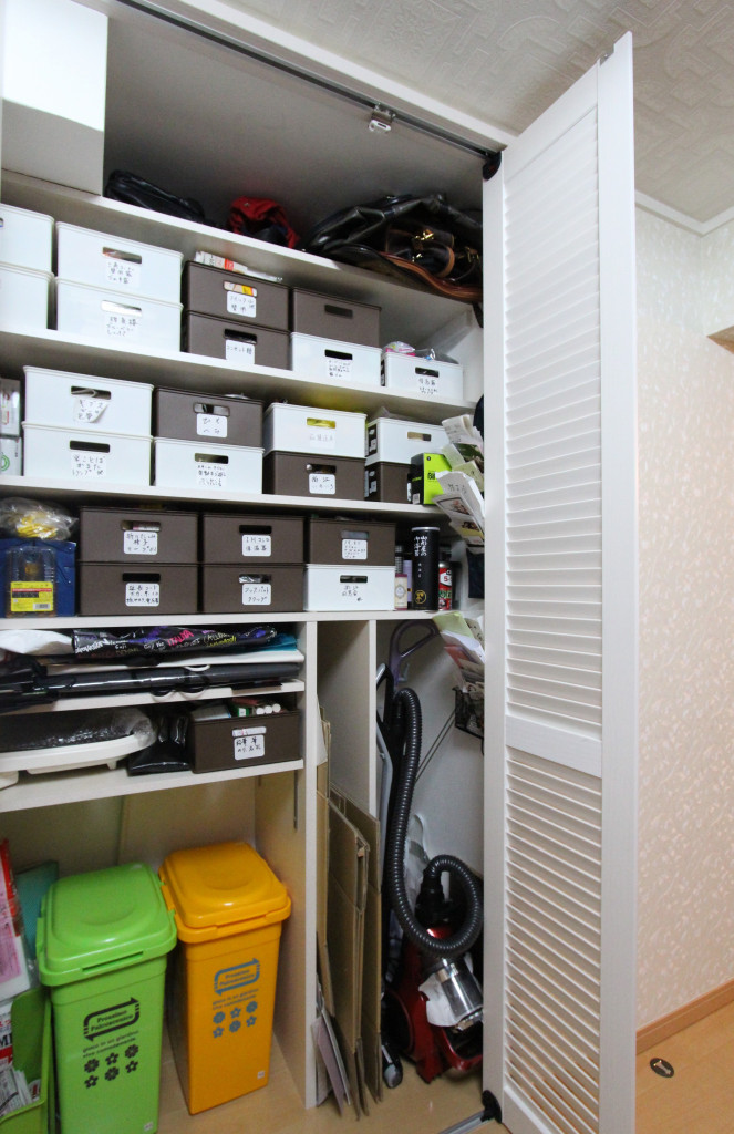 ゴミ袋、リサイクル用品、段ボール等を収納しています。