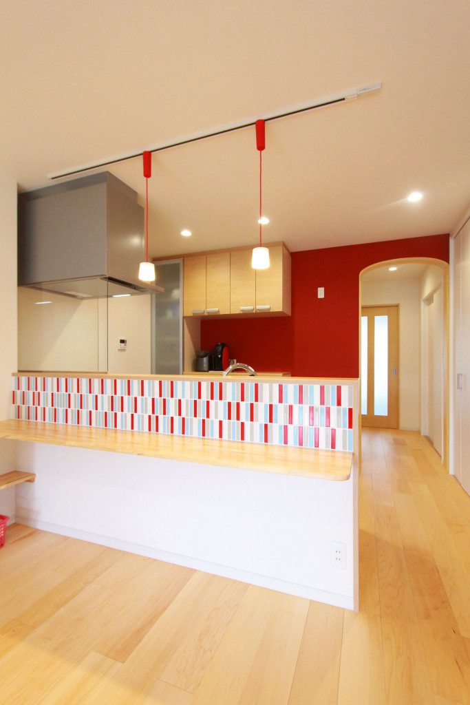 キッチンの背面にはタイルの色に入っている赤のアクセントクロスにし、アーチの開口を設けた先には・・・!!