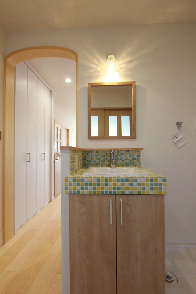 洗面のカウンターと立ち上がり部分にモザイクタイルを使用しました。