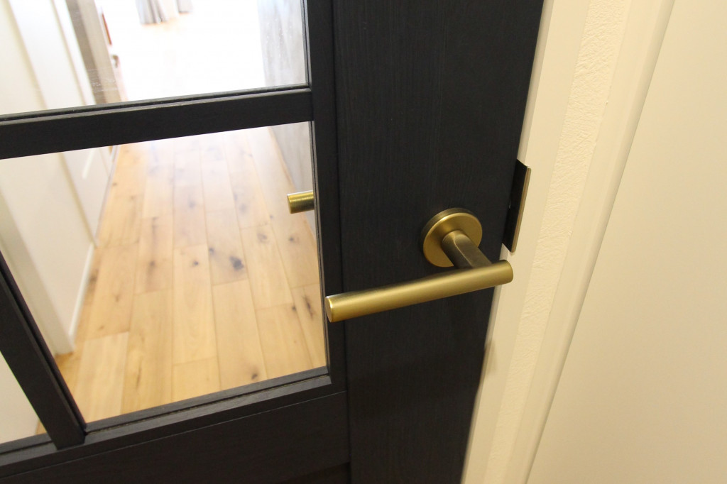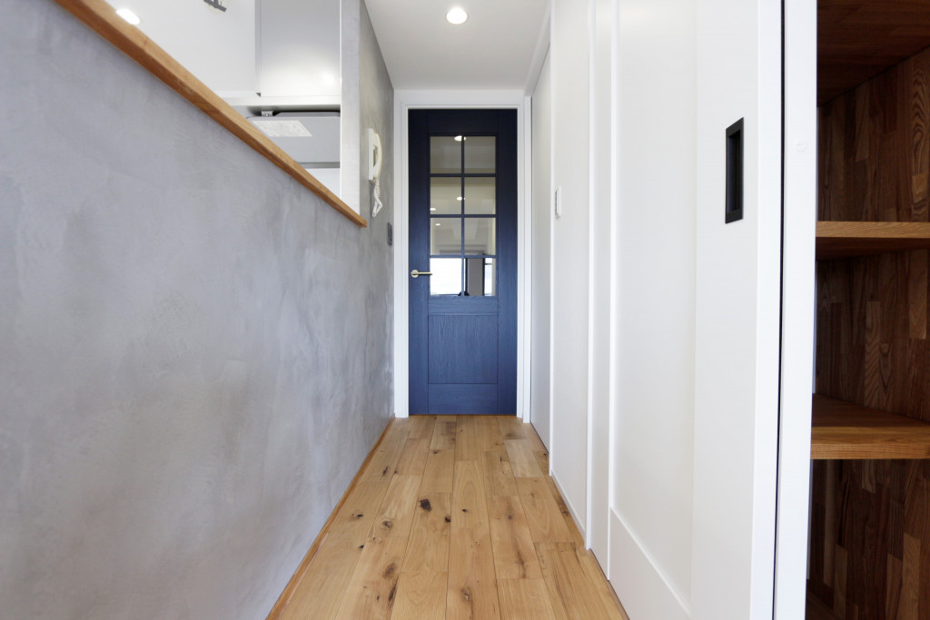 LDKへと繋がるネイビーの建具。PanasonicのクラフトレーベルシリーズのLH型、ネイビーオーク柄を採用しました。床のオーク材と組み合わせることでシンプルでカジュアルな空間に。帰宅時に家族の気配を感じられるようにガラスを透明にしました。