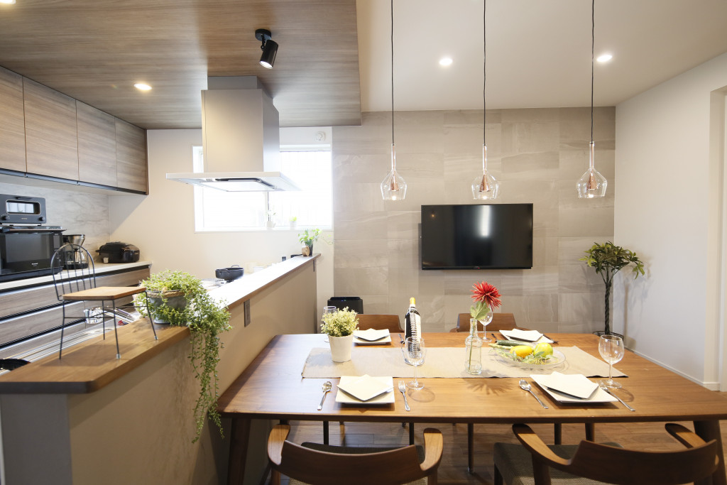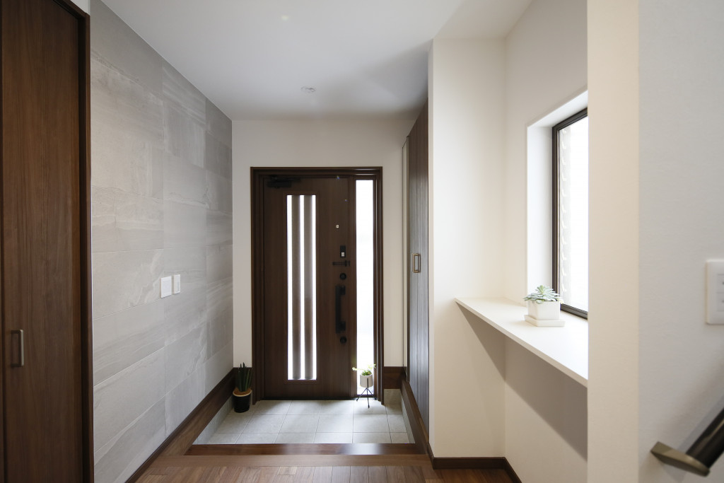 調湿・脱臭・有害物質の低減効果のあるエコカラット。快適な湿度を生み出し、暮らしを爽やかにしてくれます。I様邸ではストーングレースのダークグレーを使用し上質な空間に。また、玄関とダイニングのエコカラットをお揃いにすることで空間に統一感を持たせました。