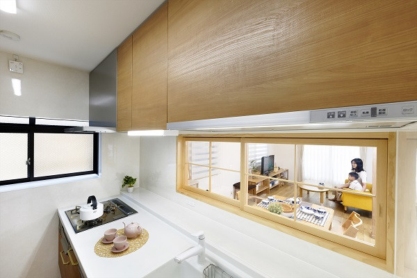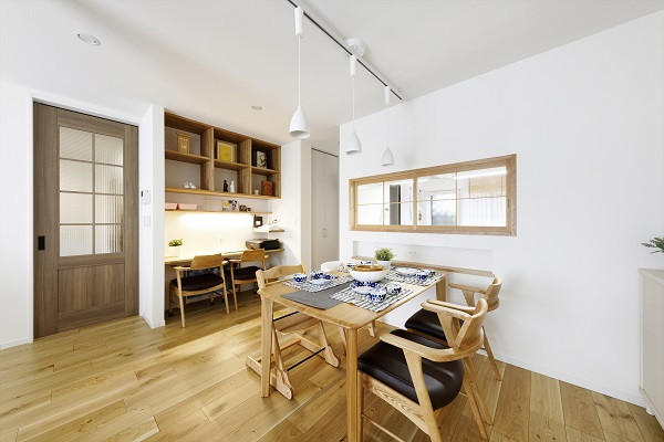 お子様がまだ小さいため、クローズキッチンでかつLDKの様子も見守れるキッチンをご希望だったM様。空間を仕切った上でリビングと対面になるようキッチンを配置し、前に室内窓を設けました。ダイニングの隣には、PC作業やお子様が宿題をするためのスタディスペースを造作。キッチンからいつでもご家族の様子を伺うことができます。