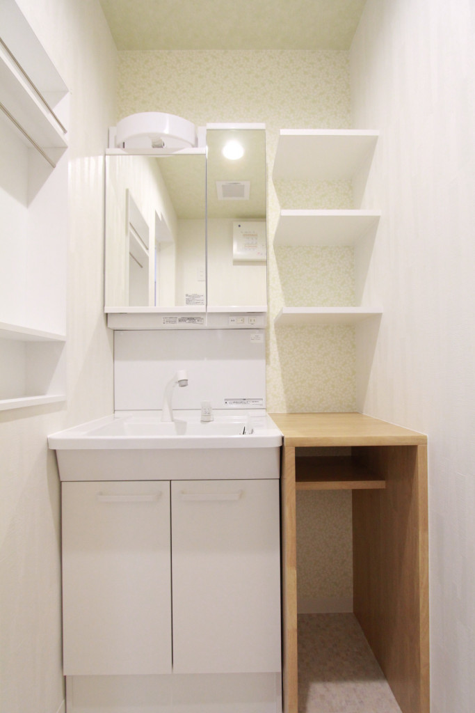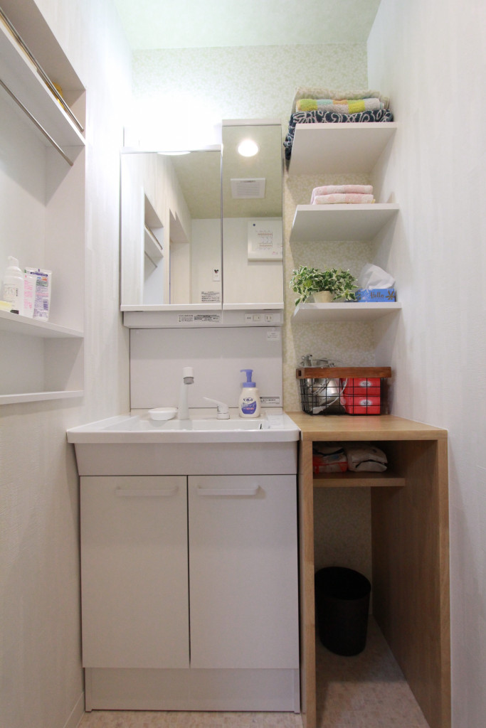 洗面は、タオル・ティッシュ・ドライヤー・ゴミ箱などの置き場所があるので、