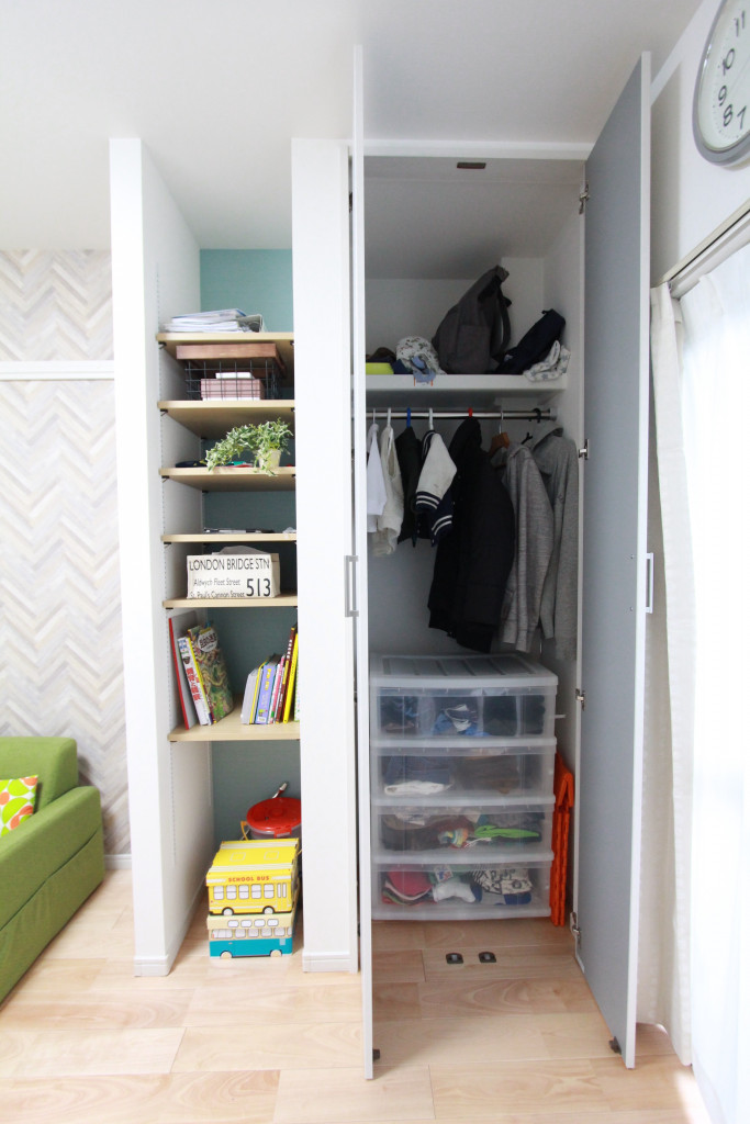 リビングの収納の中には、引き出し付きの収納ケースを入れて頂き、