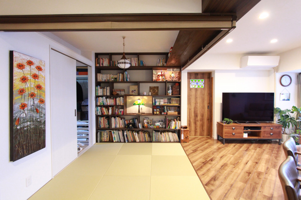 そこで畳コーナーに本棚を造作。中心には奥様の作品展示スペースに♬