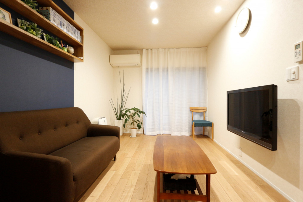 アクセントとしてリビングスペースだけ紺色のクロスを貼り分けました!