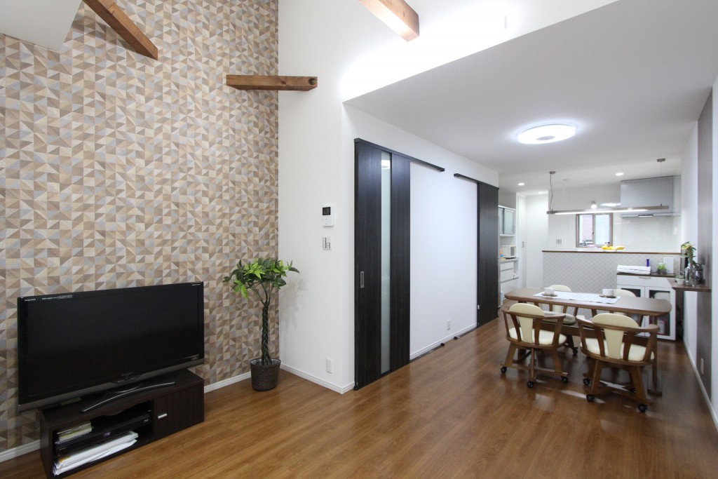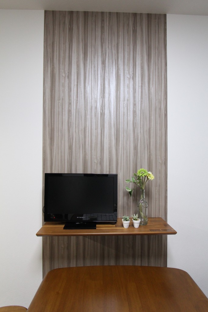 ごはん食べながらTVを見たい!ということでダイニング横にTV置き場を造作。その背面を張り分け