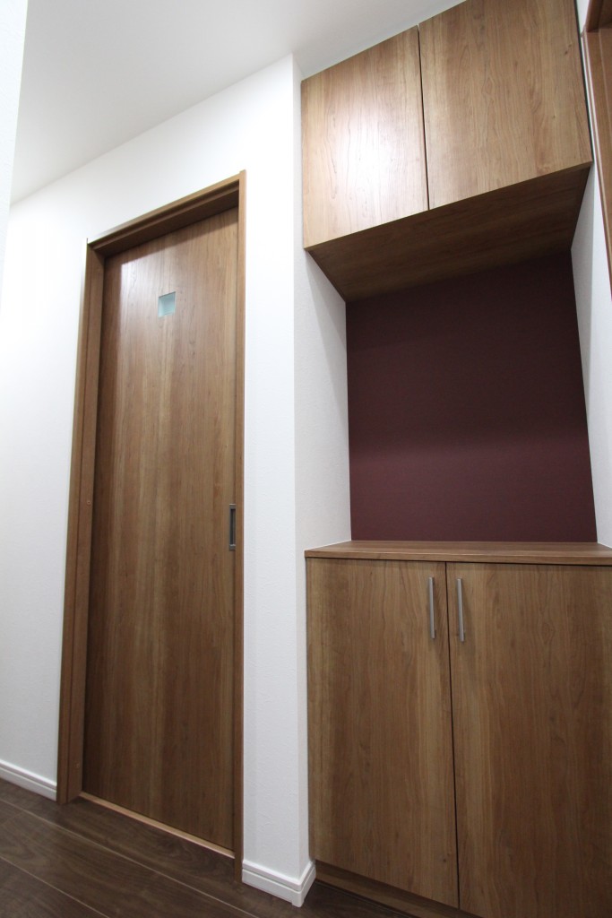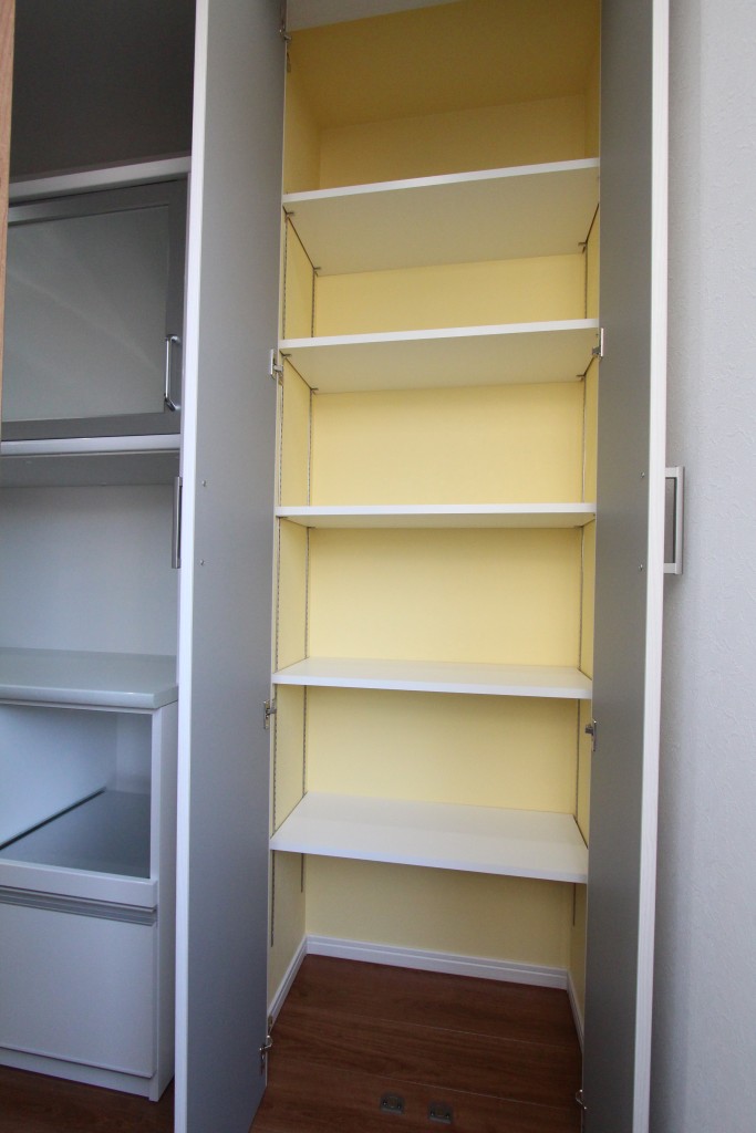 キッチン横には冷蔵庫や食器棚・パントリーを造作させていただきました
