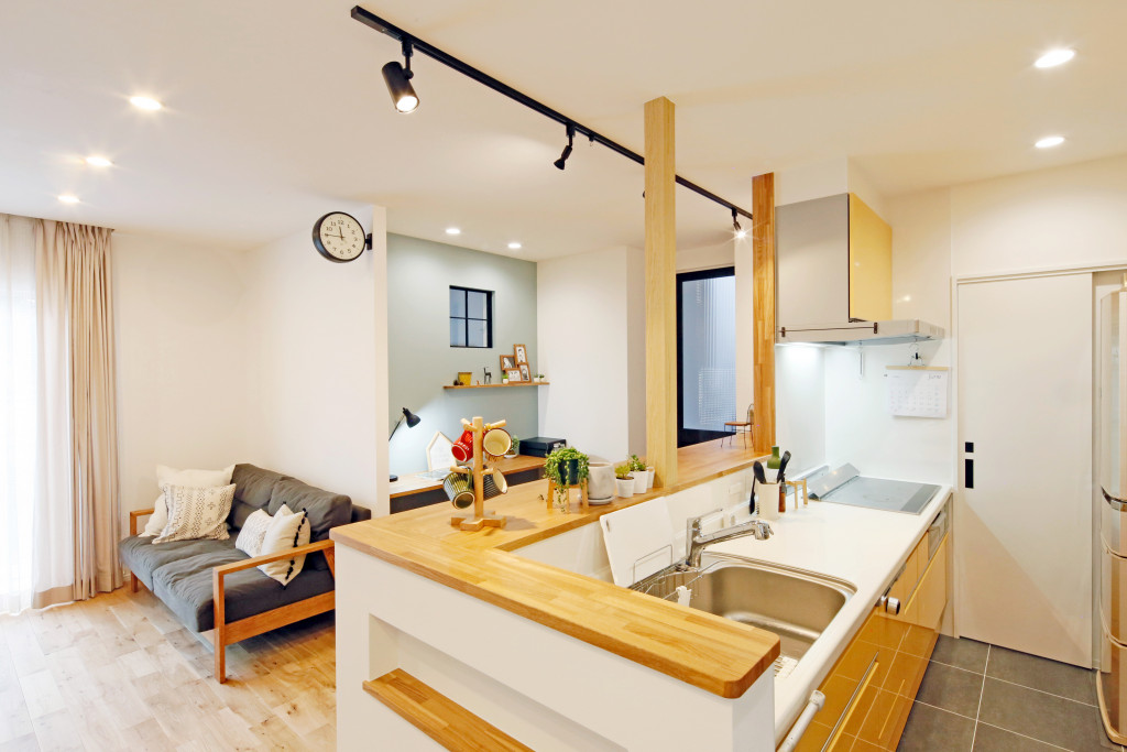 お母様の大事にされていたキッチンを再利用し、元々壁付けキッチンでしたが、壁を取り払い、お子様が見守れるよう対面キッチンにしました。
