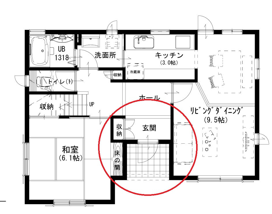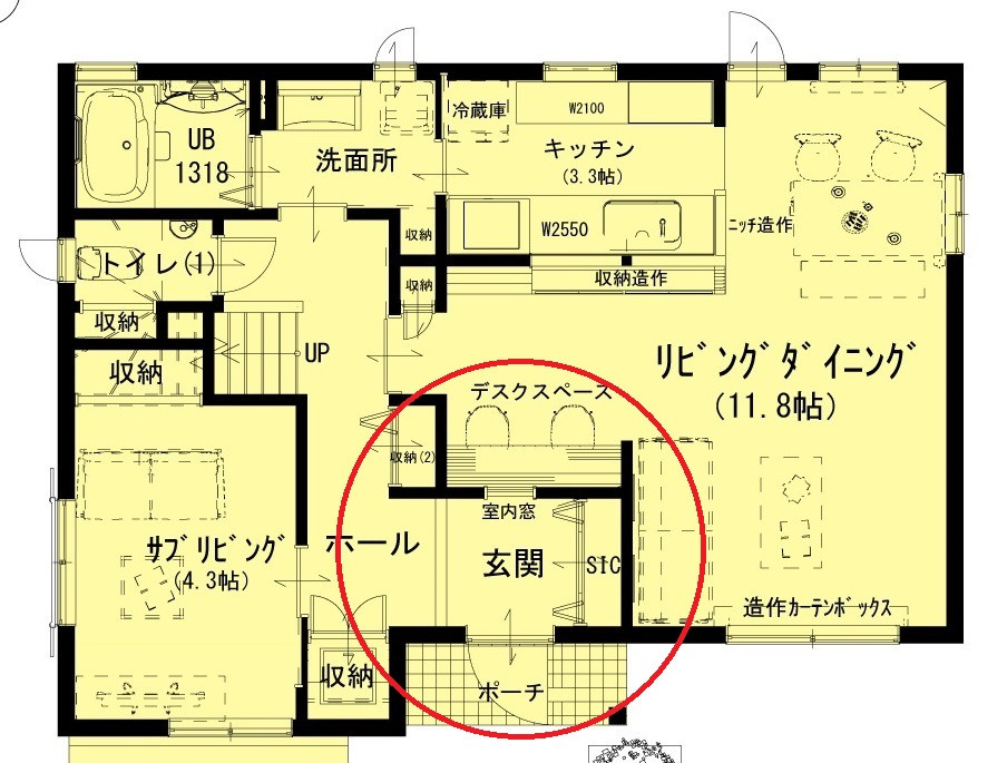 リフォームにあたり、元々玄関のポーチ部分を玄関にすることでLDKを広くし、お子様のスタディスペースを設けました。