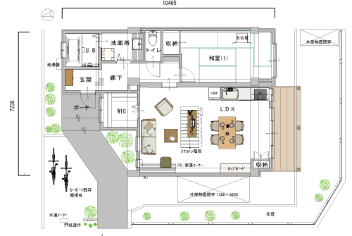 空間を分断することなく、窓からの光や風がLDKを通り抜けます。