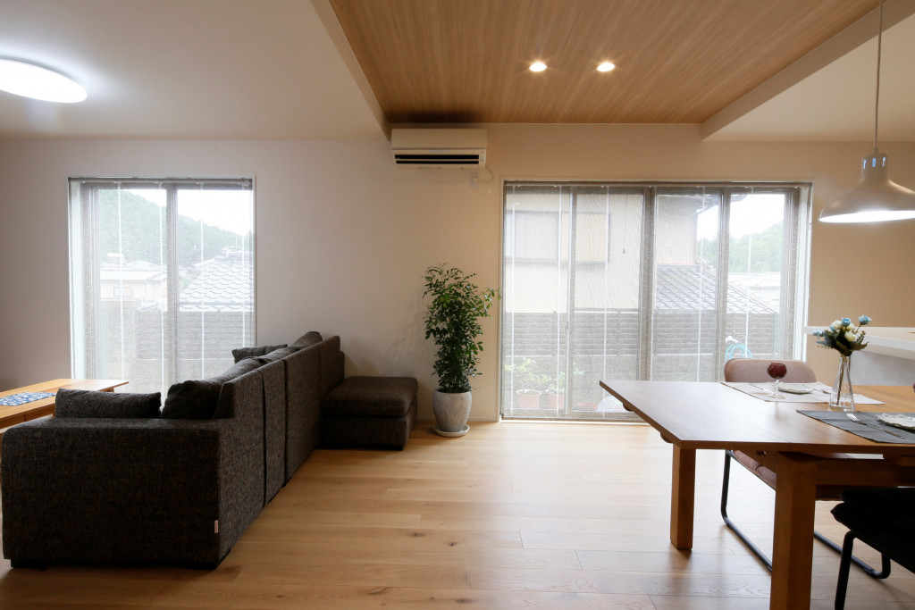 LDKを広くしたいというご要望から、既存の柱や壁を撤去して約20帖の空間が実現し、さらに耐震補強をしっかり行うことで、評点1.0以上(一応倒壊しない)とすることができました。梁補強を施すことで天井高が2m30㎝となり、一般の高さより10㎝程低くなりましたが、高さが確保できた部分を折り上げ天井のような形でご提案。アクセントクロスを取り入れることでコントラストによる対比効果が生まれ、天井の低さを感じさせず、お部屋に開放感と奥行感が生まれました。Y様と打合せを重ねながら理想の空間をつくることができました。