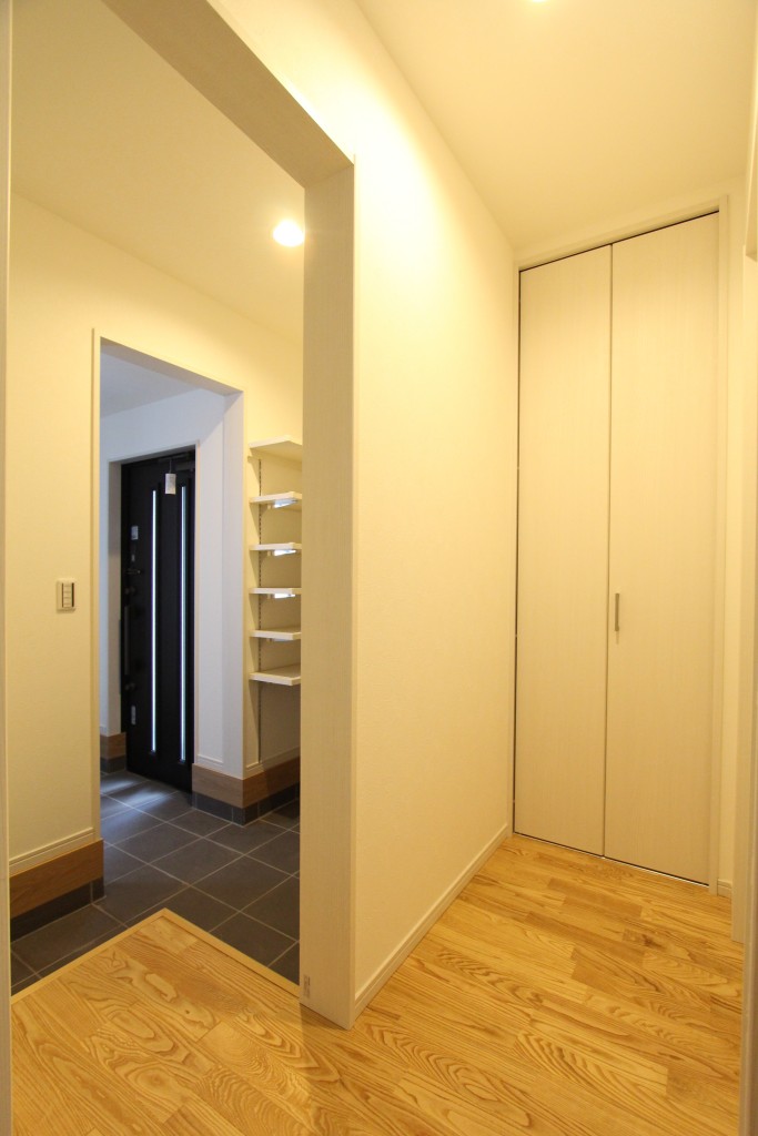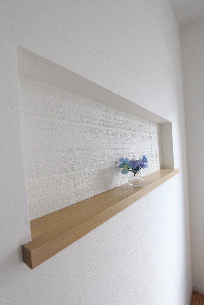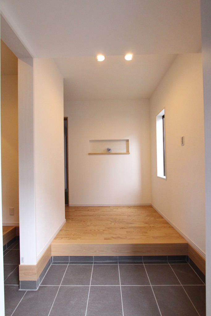 広々とすっきりした玄関です。正面にはシンプルなニッチ棚ですが、
