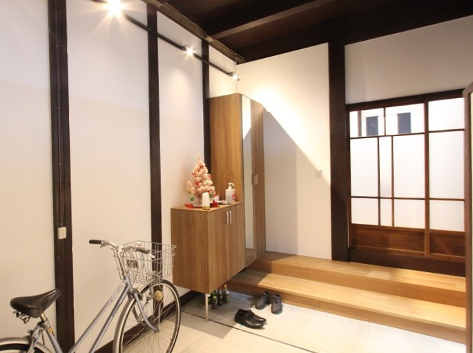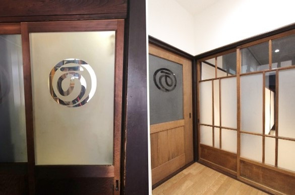 築100年を超えるご実家にお住まいのM様。元々和菓子屋さんだった頃の名残で、屋号のデザインが入ったガラス建具が当時のまま残されていました。和の趣をできるだけ残しつつ、土間の段差解消と照明計画を変更するのみに留め、古建具を調整し再利用することに。お客様を出迎えるエントランスで、ご家族の想い出を継承していく新たなシンボルとして生まれ変わりました。