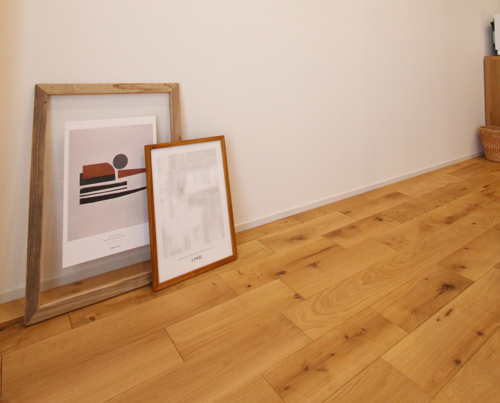 床材には適度な硬さもあり、耐久性もあるドナオークを選択。あえて節のあるグレードにすることで、オーク材特有の高級感ある木目にシンプルなインテリアが映える空間になります。