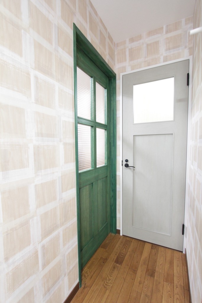 K様邸のLDKの入口は無垢のドアですが、グリーンの素敵な建具ですが、こちらなんとK様ご家族で塗装されました