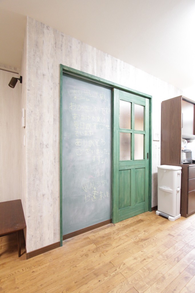 建具の後ろにこちらのサプライズで黒板クロスを貼らせていただきました!