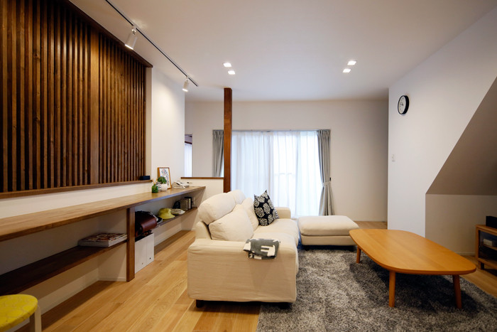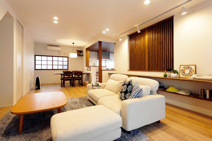 風や光を通し、緩やかに目線を隔てる格子は、閉鎖感を感じさせることなく適度に空間を分けてくれます。洗面所への動線が暗いことにお悩みだったK様邸では、洗面所とLDKをつなぐ通路に格子を設置。LDKの明かりや家族の存在を格子を通して感じられるようになりました。