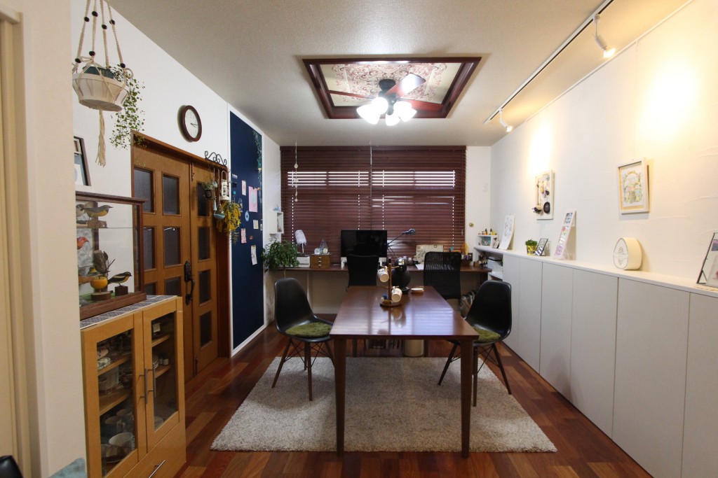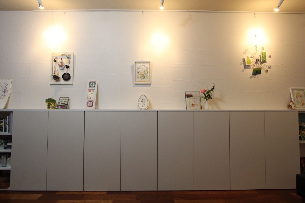 上部の壁には珪藻土を塗り、ピクチャーレールやスポットライトをつけ、ギャラリースペースになりました♪