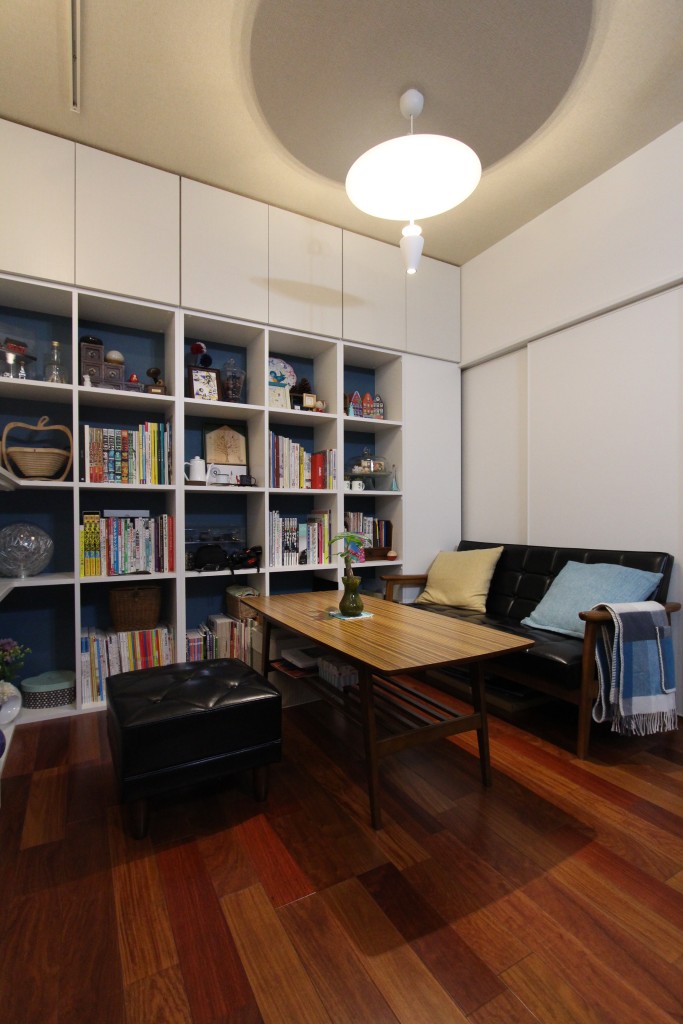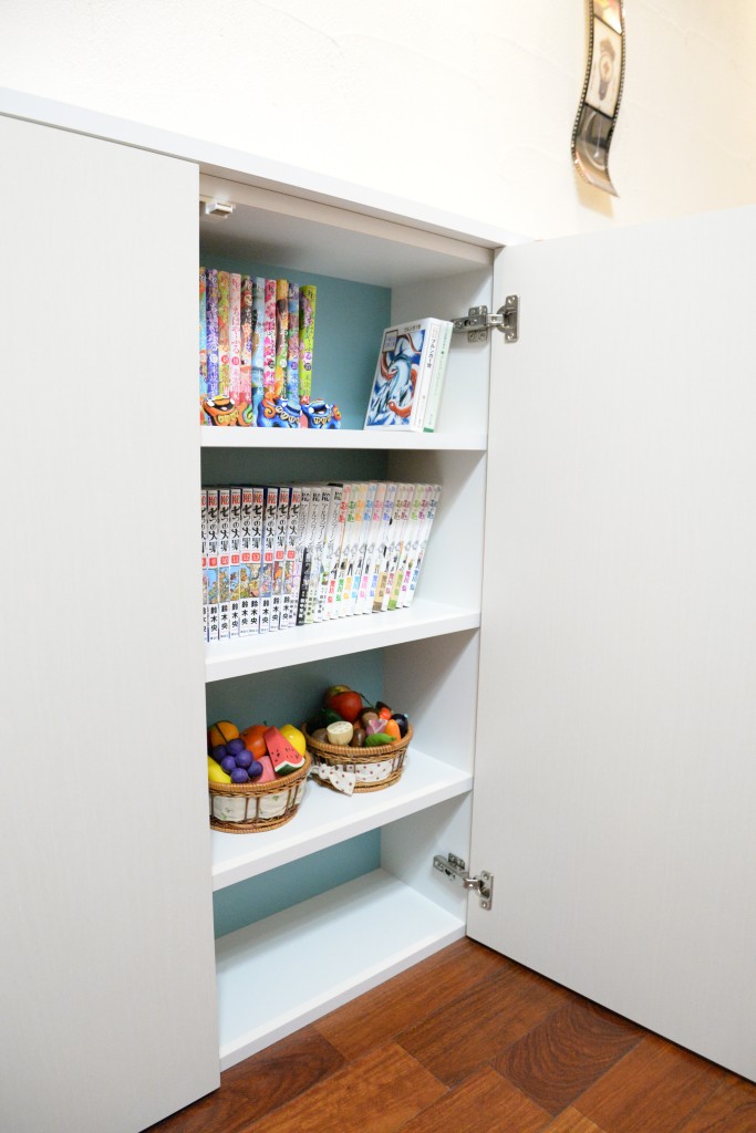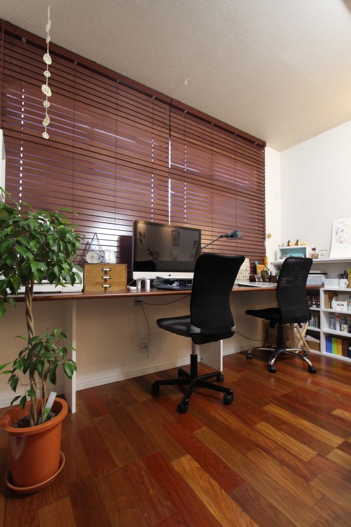 ワークスペースはデスクと壁面収納で本等をしまえるように扉付の隠せる収納に!