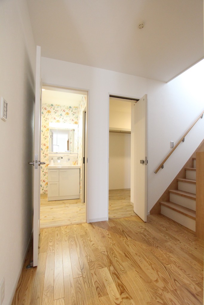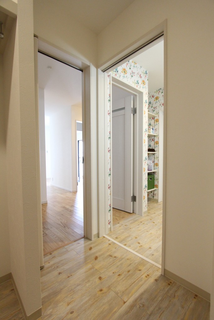 ウォークインクローゼット側から見た廊下と洗面所です。