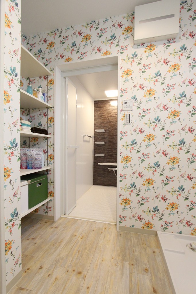 洗面所の中にも空間を利用したたっぷりの収納棚を設置しているので