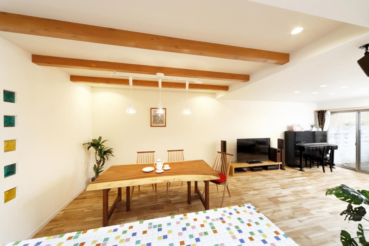 無垢の床やカラフルな色づかいで、集いが楽しいカフェ風のLDKに。