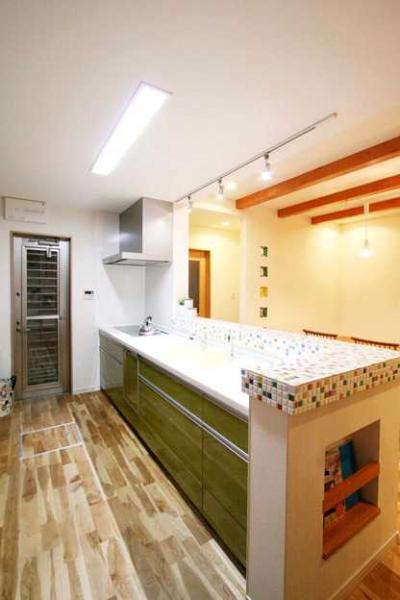 【キッチンカウンターのポップなカラーのモザイクタイルと壁面のガラスブロックがアクセント】