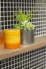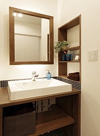 奥様:私は洗面所ですね!(鏡の)間接照明と、木とタイルの洗面台が家というより、カフェのような空間になってとても気に入っています!