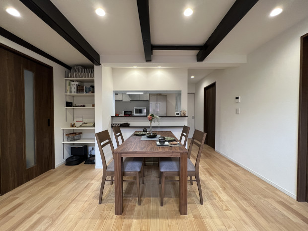 家族の様子を伺える対面キッチンにしつつ、吊戸をあえて設けたことでご希望の独立したキッチンに。