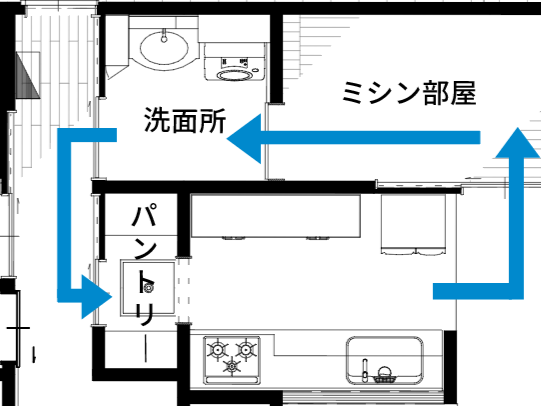 キッチン⇔ミシン室⇔洗面所 という2つの回遊動線を実現することができました!