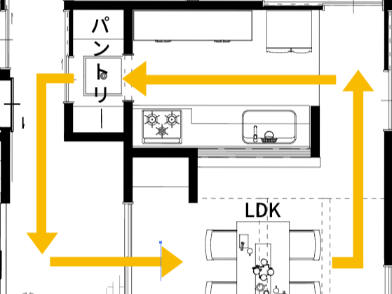 この動線なら、買った食材を玄関からそのままパントリー、そしてキッチンへも運ぶことができます!