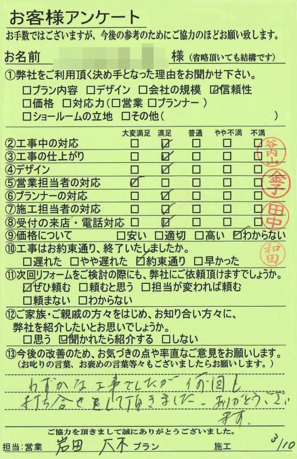 わずかな工事でしたが何回も打ち合せをして頂きました。ありがとうございます。