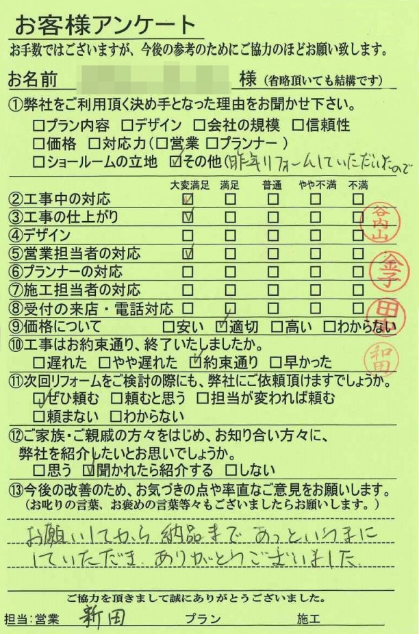 京都市西京区K様邸 家族構成/50代ご夫婦K様、いつもご依頼いただき、ありがとうございます。また、何かございましたら、いつでもご連絡下さいませ。