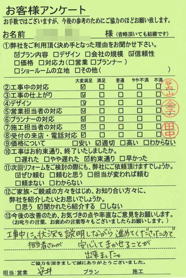 工事中に担当さんが状況を説明しながら進めて下さったので、安心してまかせることができました。