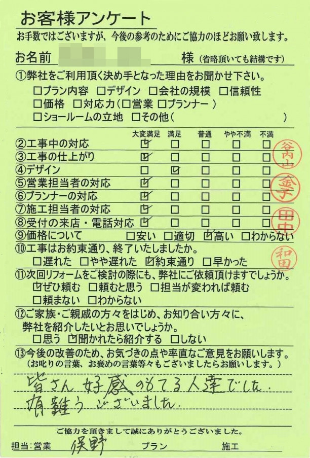 M様ご家族の方が今後快適な生活が送れるよう、努めさせていただきましたので、そのようなお言葉を頂き光栄です。また何かございましたら、いつでもご連絡下さい。