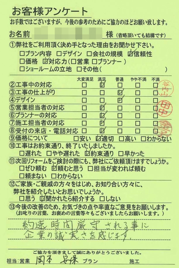 京都市西京区I様邸 家族構成/70代ご夫婦この度も弊社にお任せいただき、またこのようなお言葉を頂戴し、誠にありがとうございます。また何かお手伝いできるようなことがございましたら、
