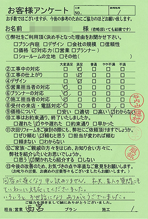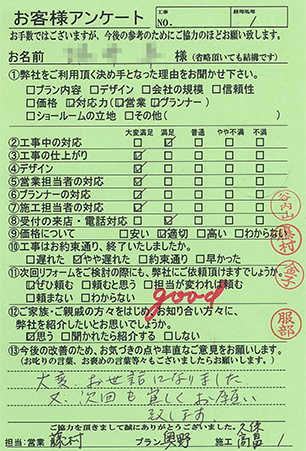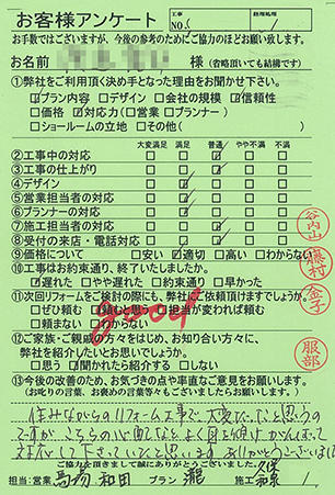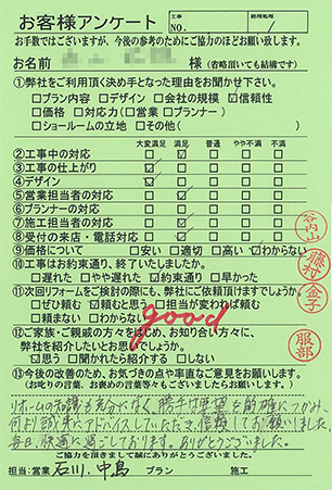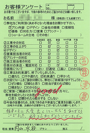 - アンケートを送り忘れており大変申し訳ありません。施工していただき1年が経過しましたが、非常に満足しています。他の部分を直していただいたり、別の家のリフォームも是非お願いしたいと思いますので今後共よろしくお願いします。