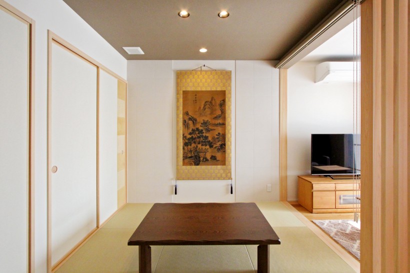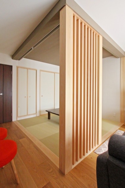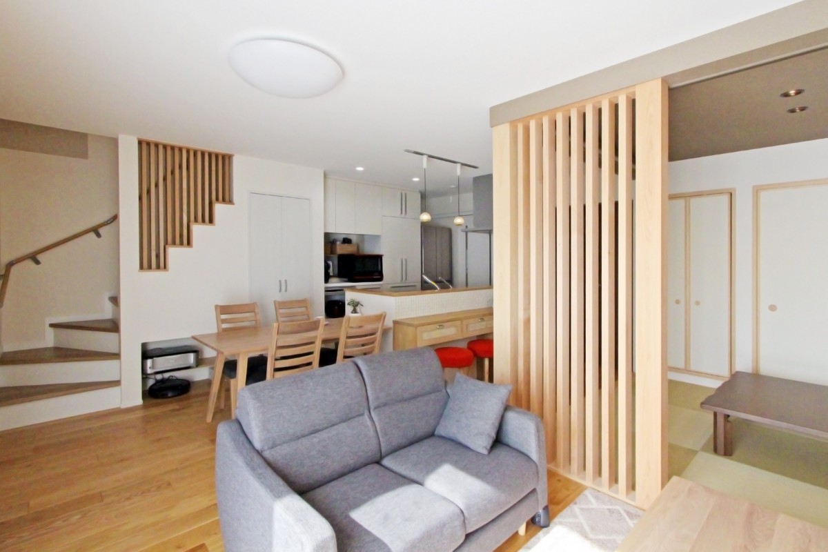 【LDK】光を遮っていた間仕切りを取り払ったことで、広々とした光あふれる明るいLDKに。一角には畳コーナーを設け、来客スペースとして活躍。また、床暖房に対応した無垢三層フローリングで暖かく過ごせます。