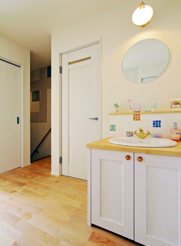 【2Fホール:洗面化粧台】朝の洗面所の混雑を回避するため、2Fホール部分にも洗面化粧台をご提案。