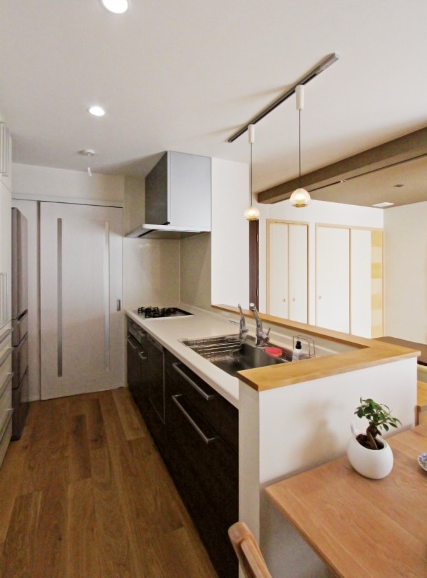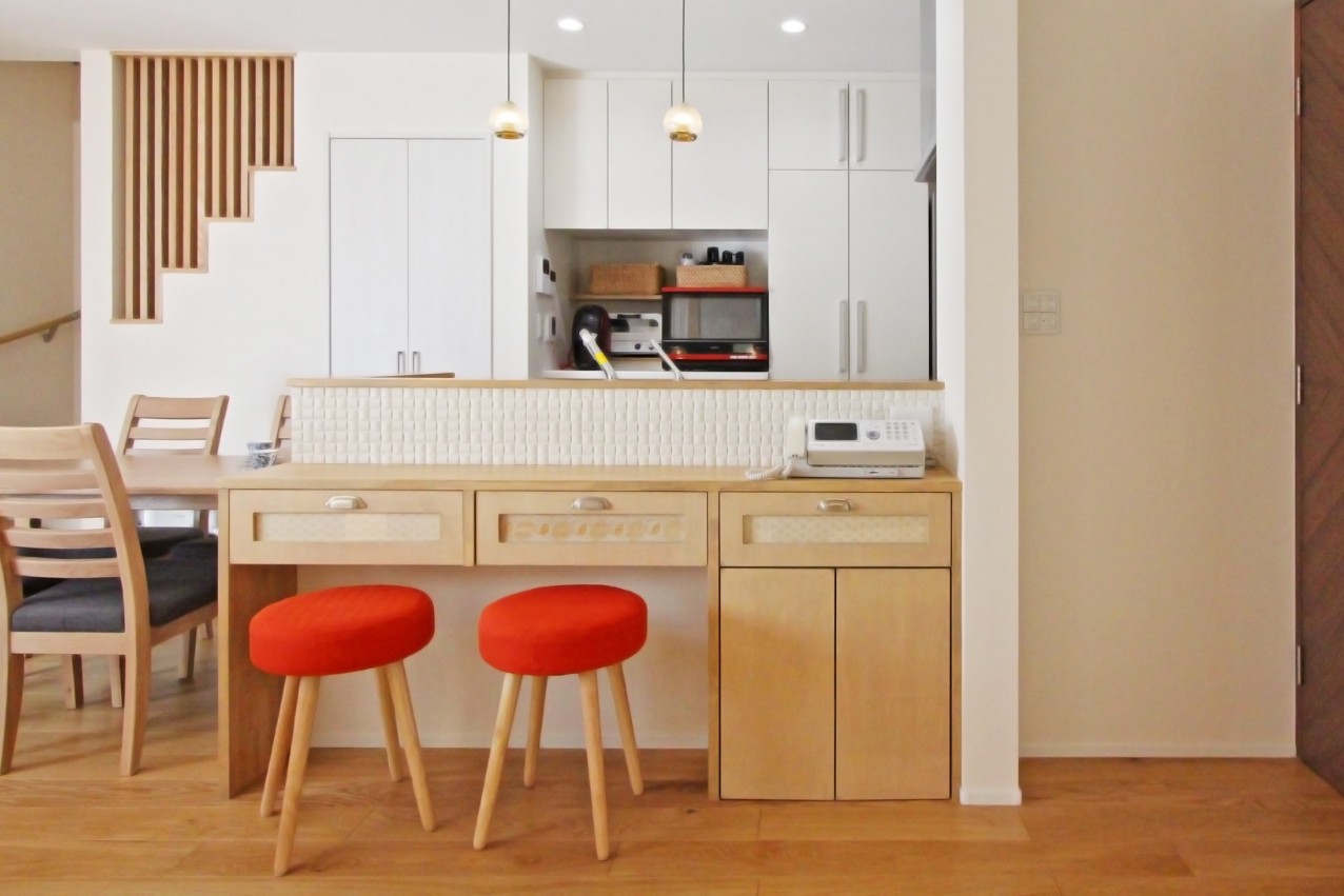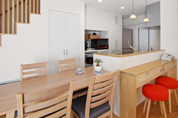 【キッチン】娘様と楽しく料理ができる開放的な対面キッチンに。隣にダイニングテーブルを置く事で調理スペースの延長として使用でき、配膳や食事の後の片づけも容易になりました。