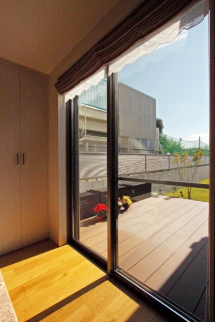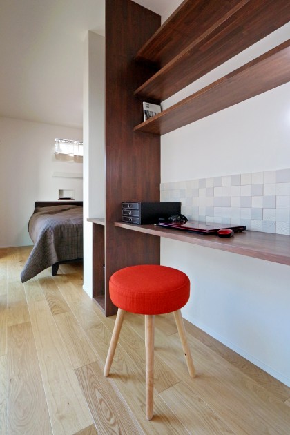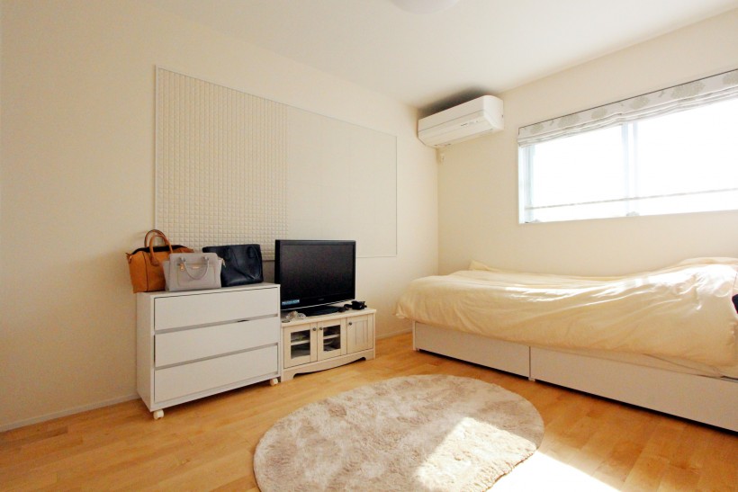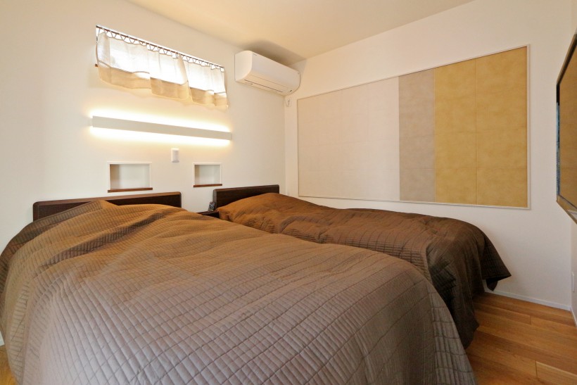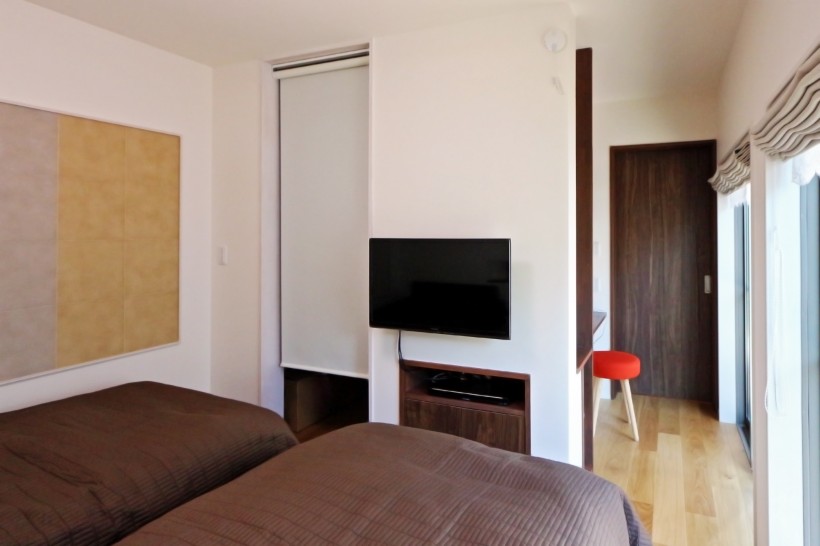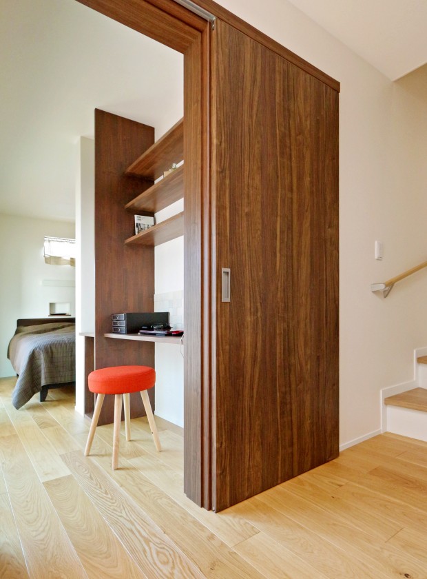 【1F主寝室】起床から就寝まで1Fで生活が完結できるように、ご夫婦の寝室はLDK横に設けました。建具を上吊りにし、敷居をなくしてバリアフリーにも配慮。
