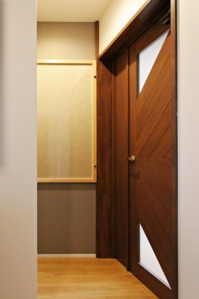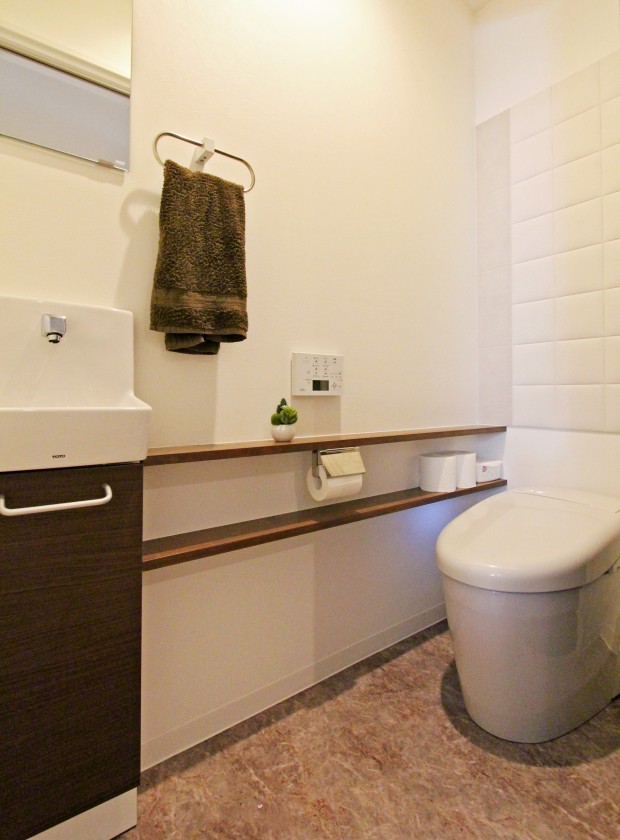 【1Fトイレ】ご夫婦好みの、ダークブラウンを基調としたモダンで落ち着いた空間に。