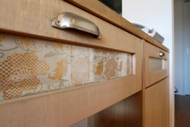 沢山の金襴の中から、お家に似合う6種類をご家族の皆様とご一緒に選定。玄関ホール、畳コーナーの襖、キッチンカウンターの引き出し、階段の壁と、様々に形を変えての活用をご提案しました。