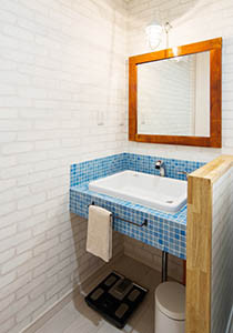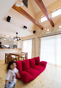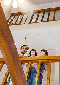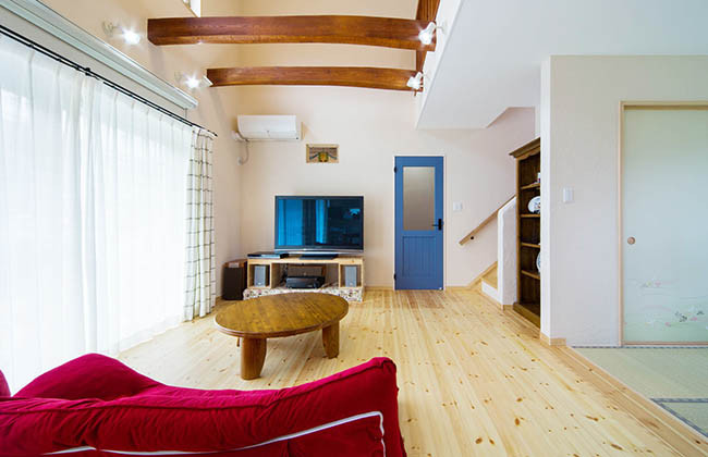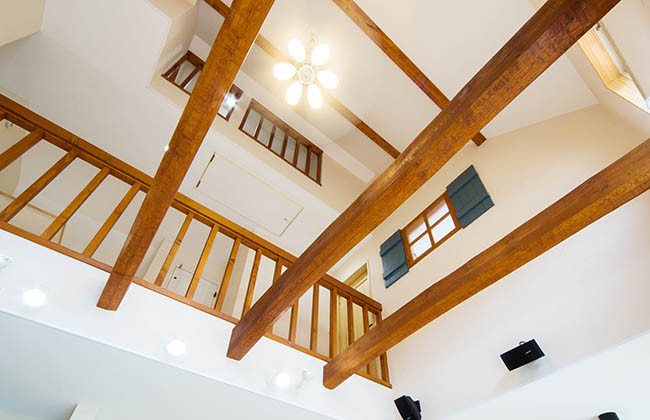 【右:2階ホール】リビングからの丸太梁、格子の手すり、勾配天井の登り梁まで塗装の色を統一し、色々な形が混在する中で、アクセント色を統一。寝室につながる吹き抜けの窓にも外部と同じポイントのブルーの飾り雨戸を設置。